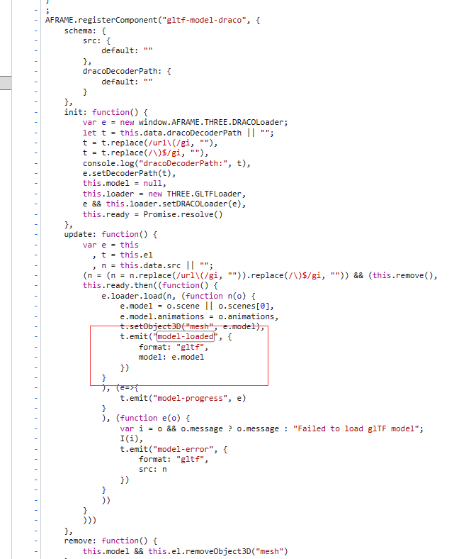 这里的init只是生成了loader,加载模型的操作是在update方法,在这里加载模型相较于在init,相同的是都会在第一次挂载执行,唯一不同的是update在setAttribute()时会再次执行。如果需要切换加载模型的时候,便可以将初始化代码区分开。